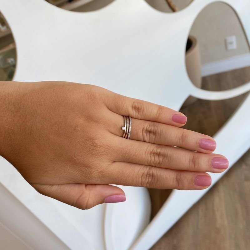 Anel prata800 3 aros lisos e cravejados 1 zircônia