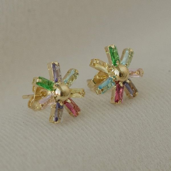 Brinco semijoia de flor com zircônias retangulares coloridas