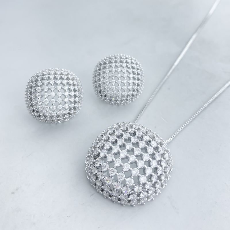 Este conjunto com banho diamante é a escolha perfeita para quem deseja um look deslumbrante! O colar possui um pingente redondo delicadamente cravejado é acompanhado de brincos pequenos que seguem o mesmo design refinado. Com 1,5 milésimo de ouro no banho e uma camada protetora de verniz italiano, a peça garante durabilidade e um brilho radiante.