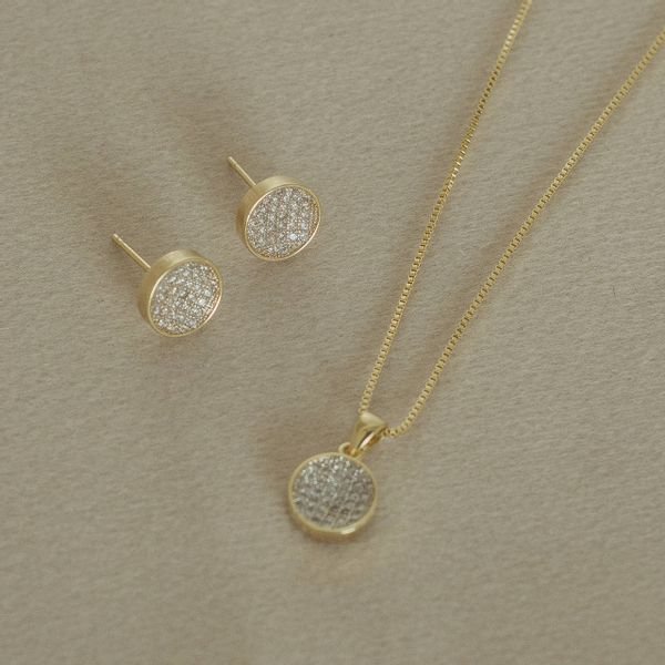 Conjuntos são essenciais para você que ama joias versáteis e combinações lindas! Esse modelo vai dar um toque romântico e elegante ao seu visual. Conjunto com colar e brincos em formato redondo bem cheio, inteirinho cravejado com pequenas e delicadas zircônias, que brilham muito a cada movimento e toque de luz. Use e abuse da sua criatividade, combinando com pulseiras delicadas, brincos delicados de segundo furo e chokers mais minimalistas. Você vai arrasar!