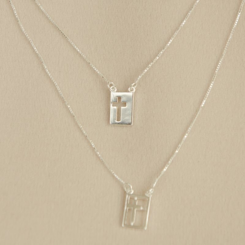 Escapulário prata 925 placas cruz lisa e vazada