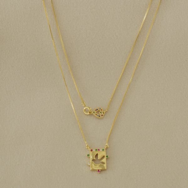 Colar lindíssimo para você mulher de fé que ama estar por dentro das tendências da moda. Um belíssimo escapulário sendo de um lado uma pomba do espirito santo e do outro um coração cravejado com zircônias coloridas, ambos com as laterais cravejadas com micro zircônias! Acessório perfeito para você usar em ocasiões especiais ou até mesmo em seu dia a dia.